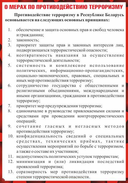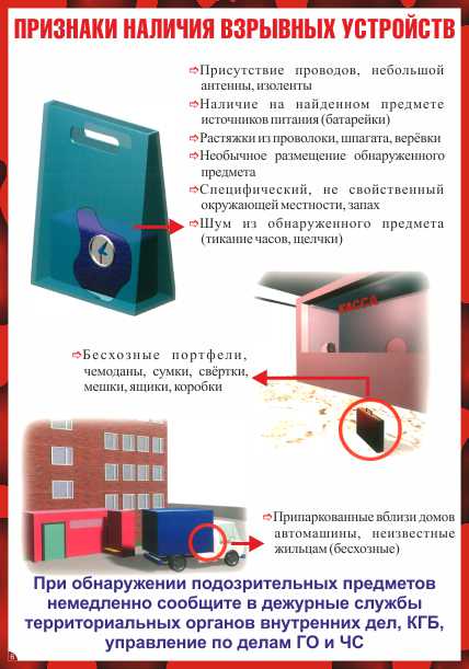 Лист 1. О мерах по противодействию терроризму. Лист 2. Предупреди-тельно-защитные меры. Лист 3. Обязанности должностных лиц. Лист 4. Действия населения при угрозе теракта. Лист 5. Возможные места установки взрывных устройств. Лист 6. Признаки наличия взрывных устройств. Лист 7. Что делать при обнаружении взрывного устройства. Лист 8. Поведение пострадавших. Лист 9. Если вас захватили в заложники. Лист 10. Телефоны для экстренного реагирования |