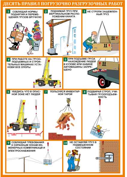 Лист 1. При работе на грузоподъёмных и строительных машинах установи все опоры. Лист 2. Не перегружай грузоподъёмные механизмы! Лист 3. На строительную площадку посторонним вход воспрещен! Лист 4. Подбирай строп, соответствующий массе и характеру перемещаемого груза. Лист 5. При подъёме груза нахождение людей в кузове или кабине автомашин запрещено! Лист 6. Не стропи защемленный груз! Лист 7. Соблюдай требования к охранным зонам инженерных коммуникаций и энергоснабжения. Лист 8. Соблюдай нормы поднятии и перемещения грузов вручную. Лист 9. Пользуйтесь инвентарной тарой. Лист 10. Поднимай груз при вертикальном положении каната. Лист 11. Работай в каске. Лист 12. Десять правил погрузочно-разгрузочных работ |